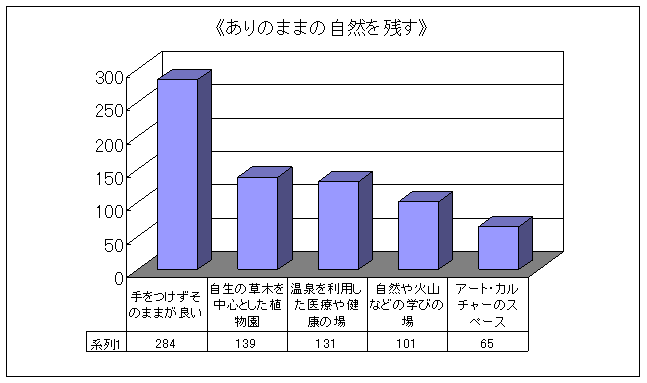 | 全世代が望んでいるのは、「手をつけずそのままが良い」「自生の草木を中心とした植物園」であり、2つを合わせると 66%となる。次に、「温泉を利用した医療や健康づくりのスペース」(各世代3位、総合3位)が良いのではないかととの意見である。団塊の世代がリタイヤをはじめ、高齢化がますます進む今日、健康に関する要望はさらに高まり、古くから効果があると言われている『温泉療法』や『東洋医学』への関心が強まっている。これは那須に向けた1つの期待と捕らえられる。 |